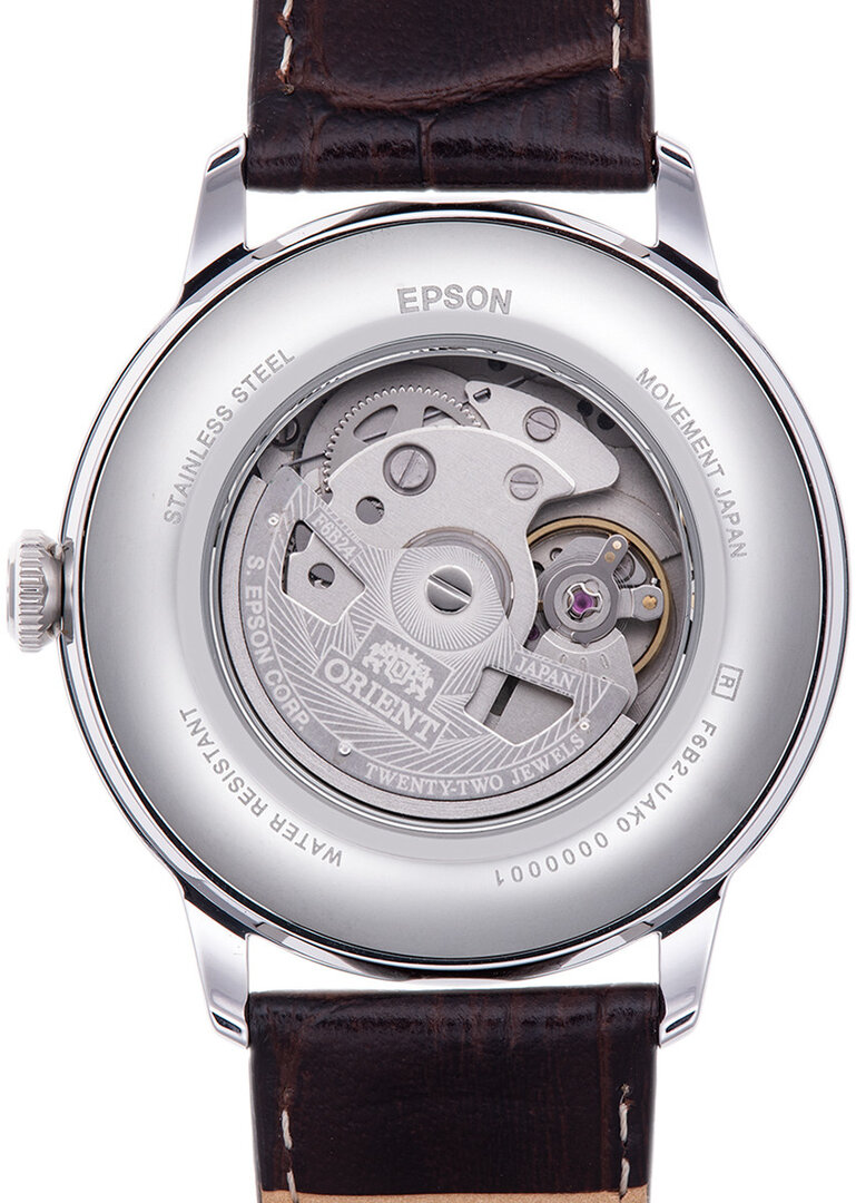Mecánico de cuerda automática. Orient F6B24, Reserva de marcha 40h, 21.600 BPH (3Hz), 22 piedras, Hackear, Posibilidad de cuerda manual, Reloj de cuerda reversible